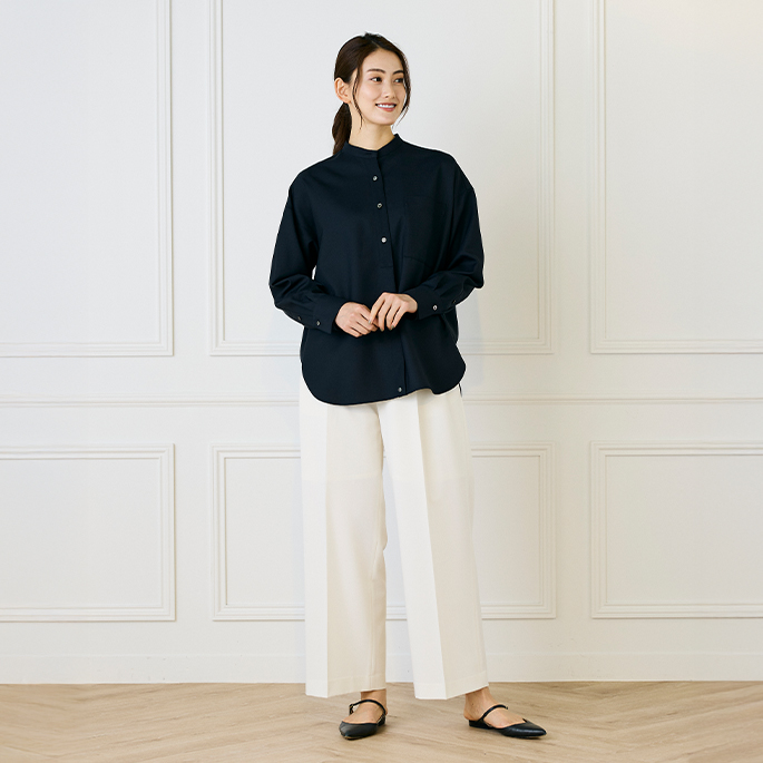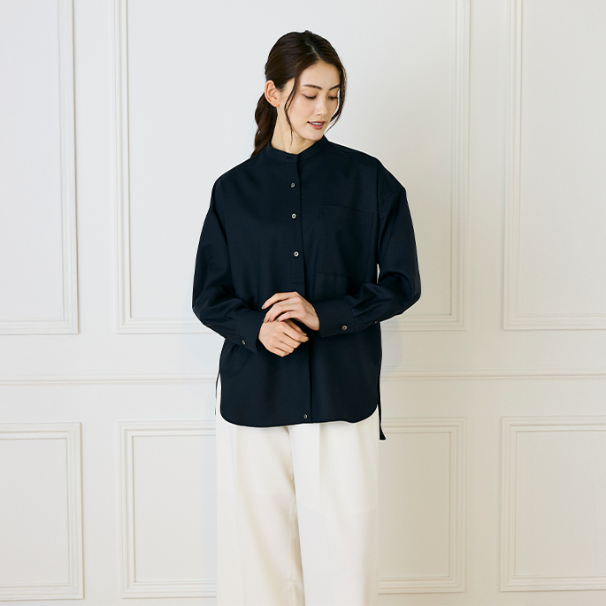 スタンドカラーのシャツは、ボタンの留め方ひとつで印象がガラリ。