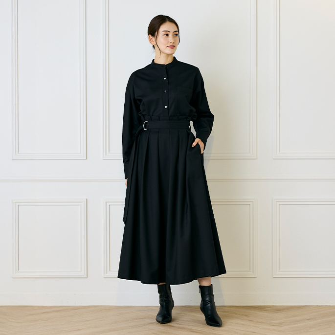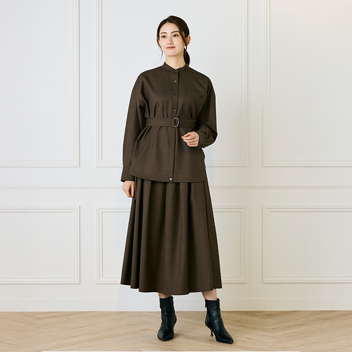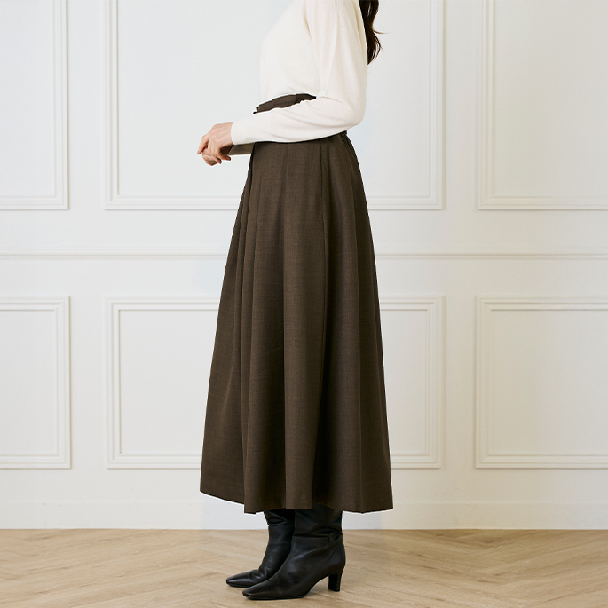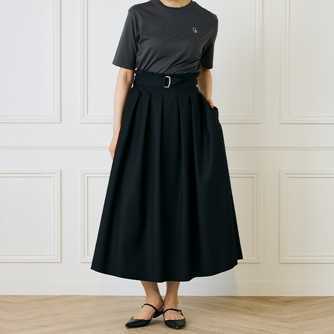 同素材のロングベルトがアクセントになった、上品なタックスカート。