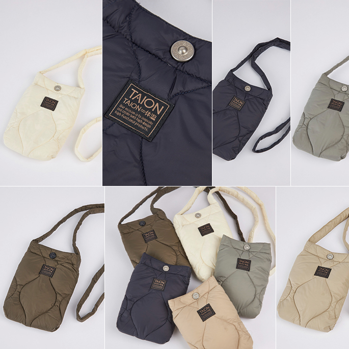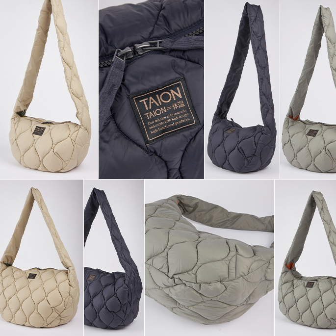 斜め格子のキルト柄、刻印入りスナップ釦等TAIONオリジナルのディテールもポイント。インナーダウンとしても最適です。